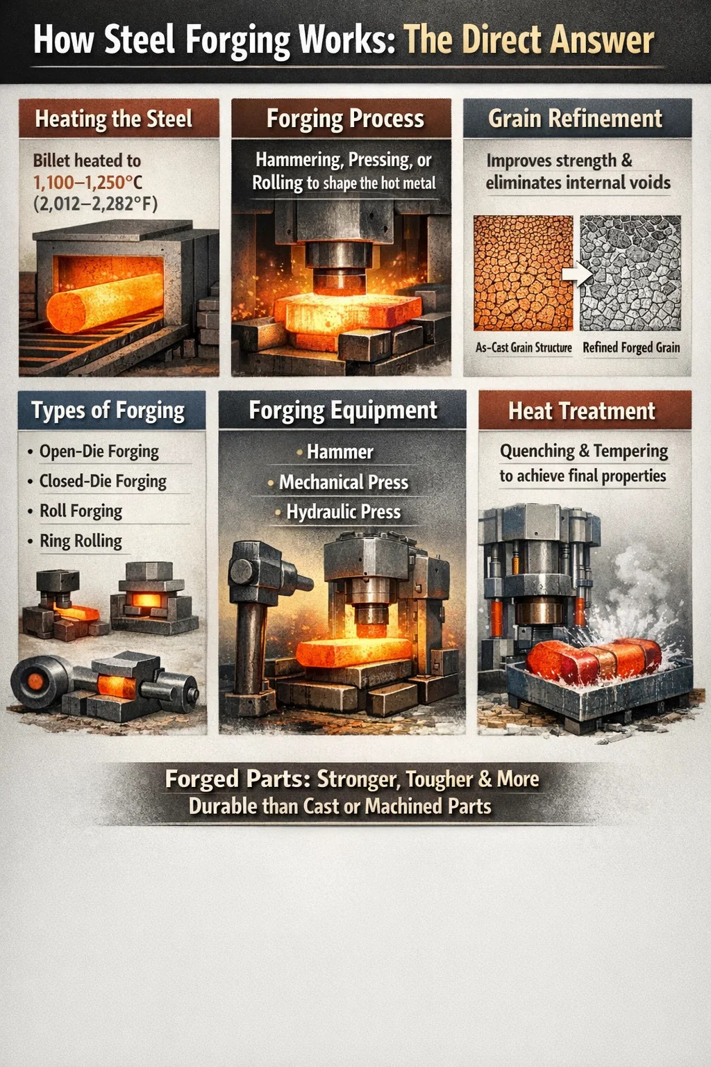 U praktičnom smislu, čelična gredica ili ingot se zagrijava do između 1100°C i 1250°C (2012°F do 2282°F) za vruće kovanje — najčešća industrijska metoda — zatim se stavlja pod prešu ili čekić koji ga deformira u željeni oblik. Oblikovani dio se zatim hladi u kontroliranim uvjetima i dovršava strojnom obradom, toplinskom obradom ili površinskom obradom.